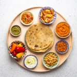 A complete vegetarian meal with 3 curries, rice, roti, salad, papad, a …