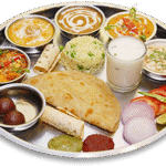 A complete vegetarian meal with 3 curries, rice, roti, salad, papad, and dessert